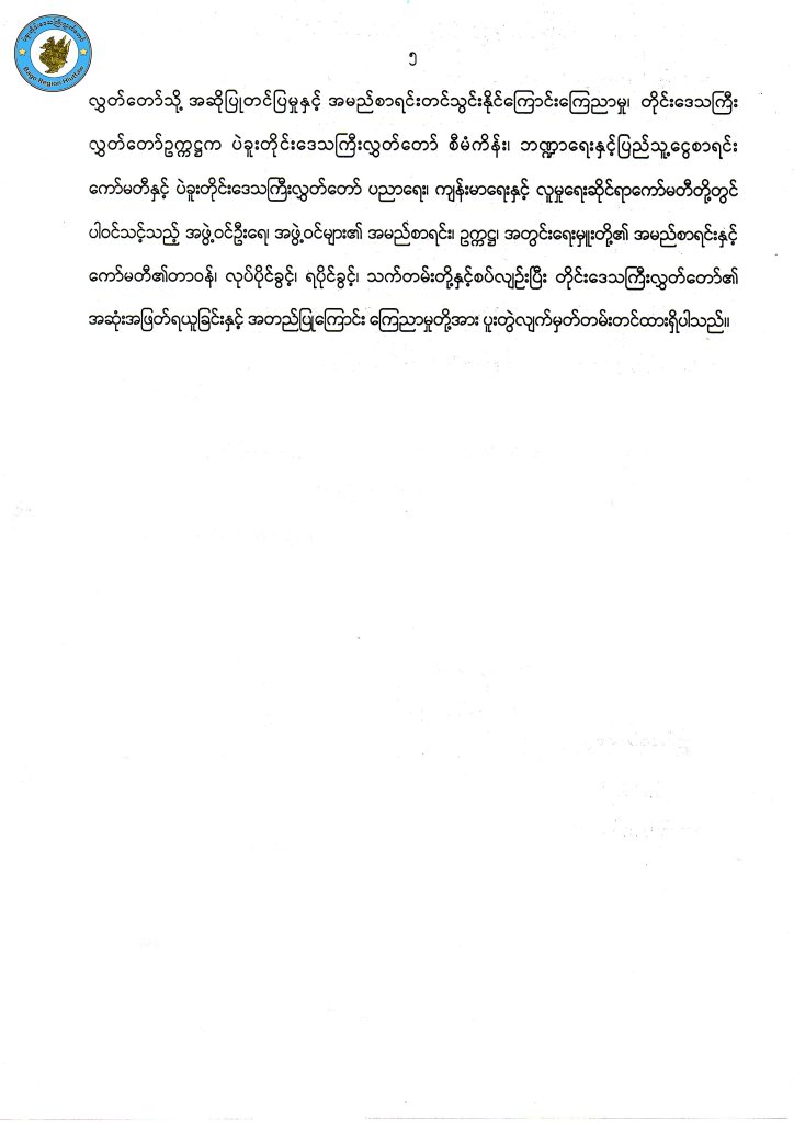 ၃.၄.၂၀၂၆ ရက် သောကြာနေ့တွင် ကျင်းပပြုလုပ်မည့် တတိယအကြိမ်ပဲခူးတိုင်းဒေသကြီးလွှတ်တော် ပထမပုံမှန်အစည်းအဝေး(တတိယနေ့) အခမ်းအနားအစီအစဉ်