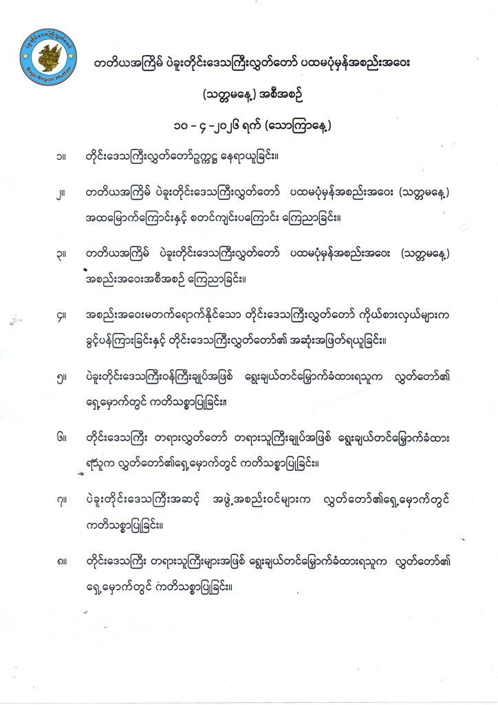 ၁၀.၄.၂၀၂၆ ရက် တနင်္လာနေ့တွင် ကျင်းပပြုလုပ်မည့် တတိယအကြိမ်ပဲခူးတိုင်းဒေသကြီးလွှတ်တော် ပထမပုံမှန်အစည်းအဝေး(သတ္တမနေ့) အခမ်းအနားအစီအစဉ်