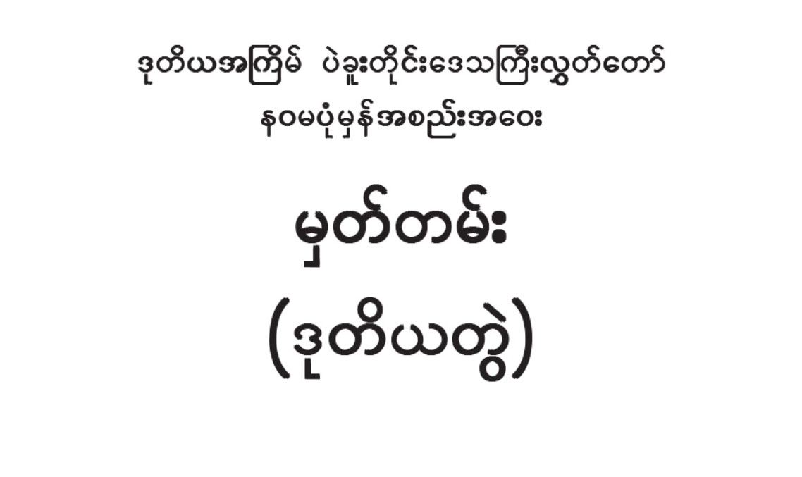 ဒုတိယအကြိမ် ပဲခူးတိုင်းဒေသကြီးလွှတ်တော် (၁၂) ကြိမ်မြောက်ပုံမှန်အစည်းအဝေး(ဒုတိယတွဲ) အားအပြည့်အစုံဝင်ရောက်ဖတ်ရှုပြီး PDF File ဖြင့် Download ပြုလုပ်နိုင်ပါသည်။